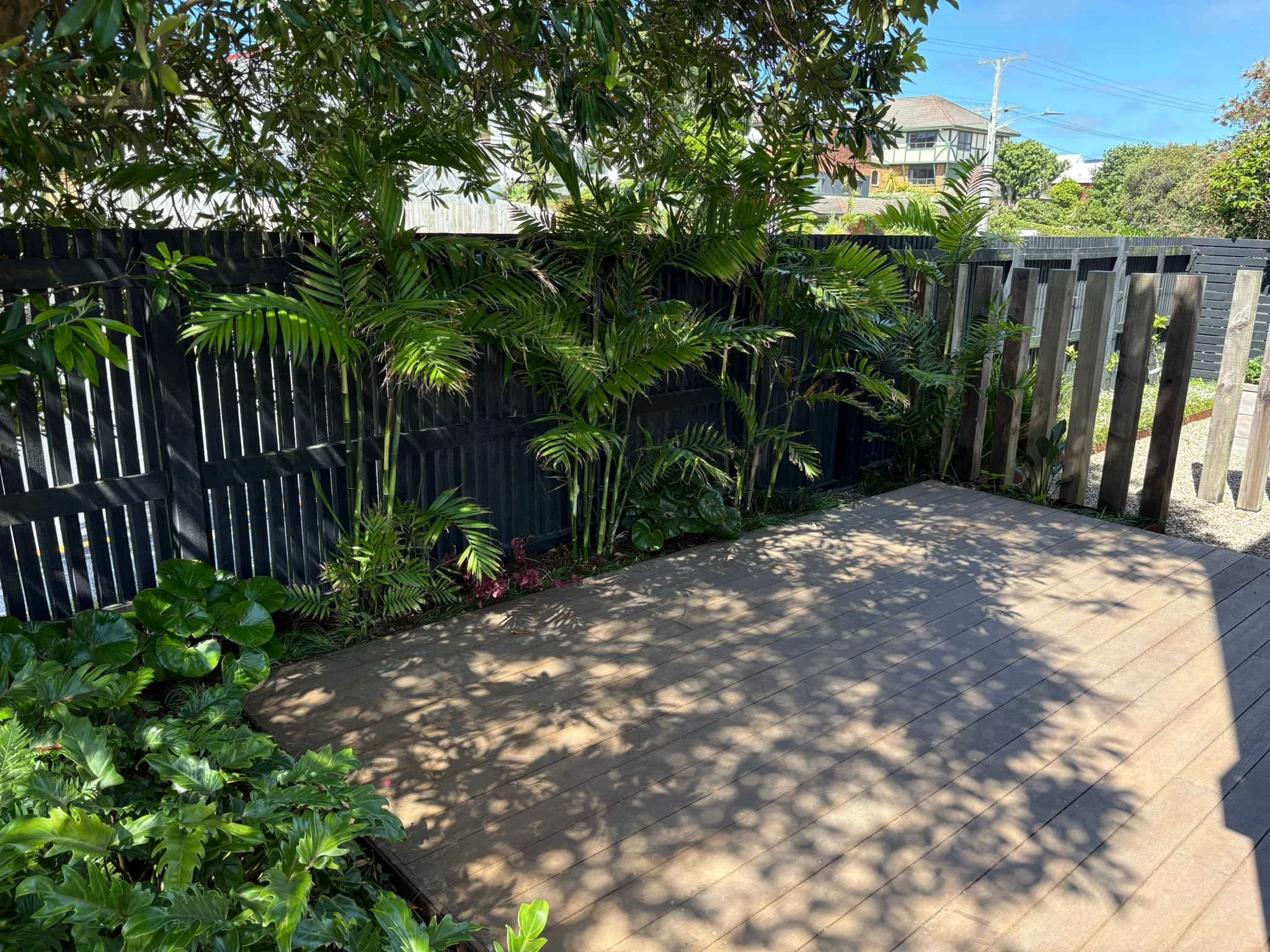 This Tauranga garden upgrade transforms the outdoor space into a tropical, lush retreat. With a new stairway, bluestone pathways, raised corten pots, veggie beds, the design blends beauty and function. Layered, low-maintenance planting adds vibrant colour and texture, and screening acts as both a feature and to create practical yet stylish spaces. A balance of tropical luxury and easy-care living, designed to complement the home’s modern architecture.