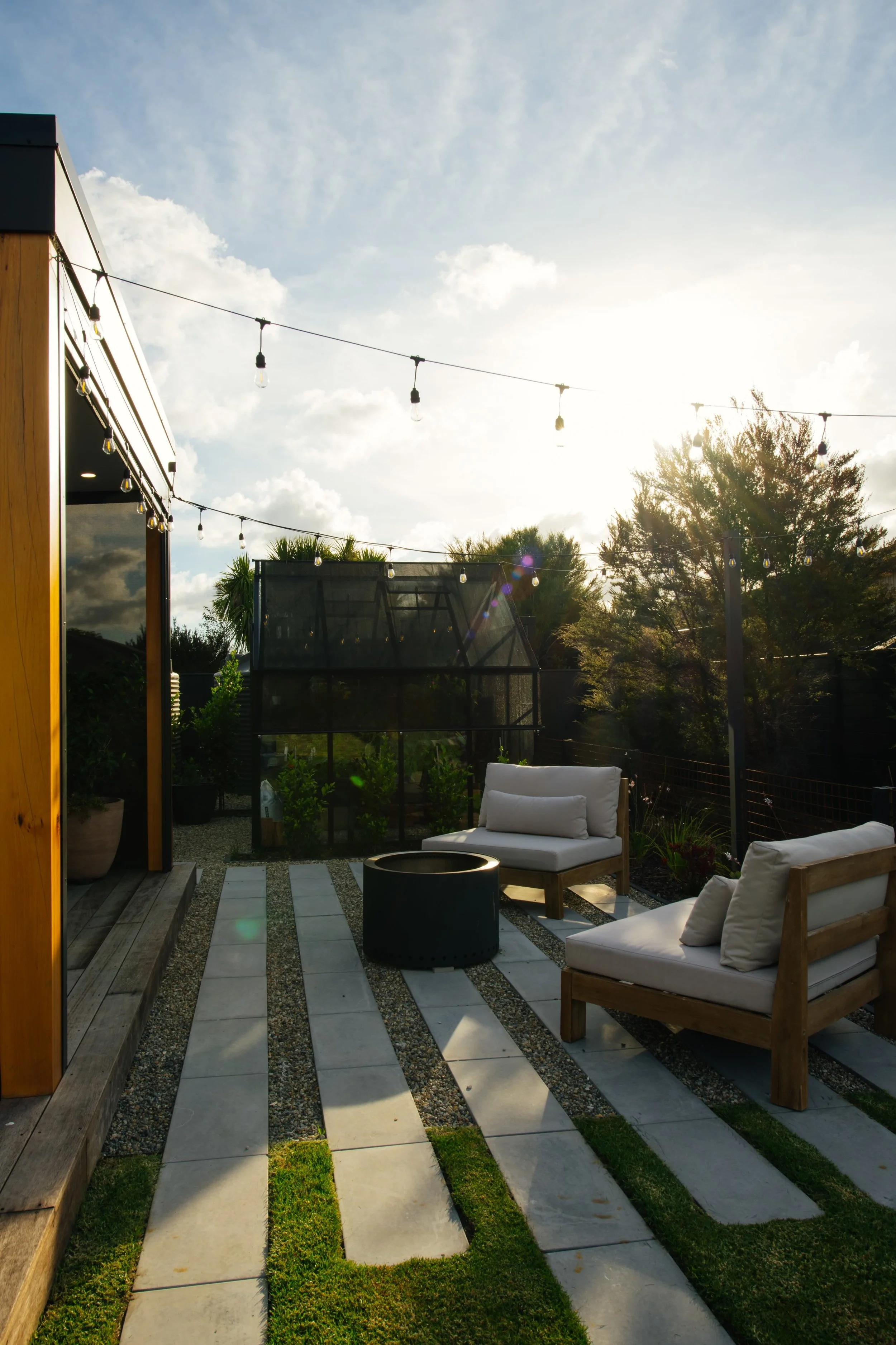 Key features include a Winter Gardenz Glasshouse with vegetable beds, a pathway and patio that blends into the lawn and fairy lights that add ambience for entertaining.
